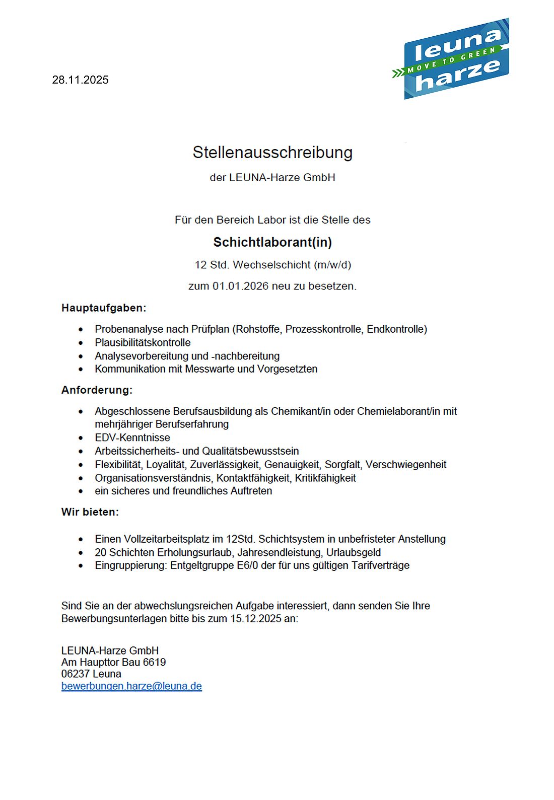 Werden Sie ein Teil unseres wachsenden Unternehmens hier am Chemiestandort Leuna. Bewerben Sie sich jetzt auf eine der unten aufgeführten Stellen oder einfach initiativ.